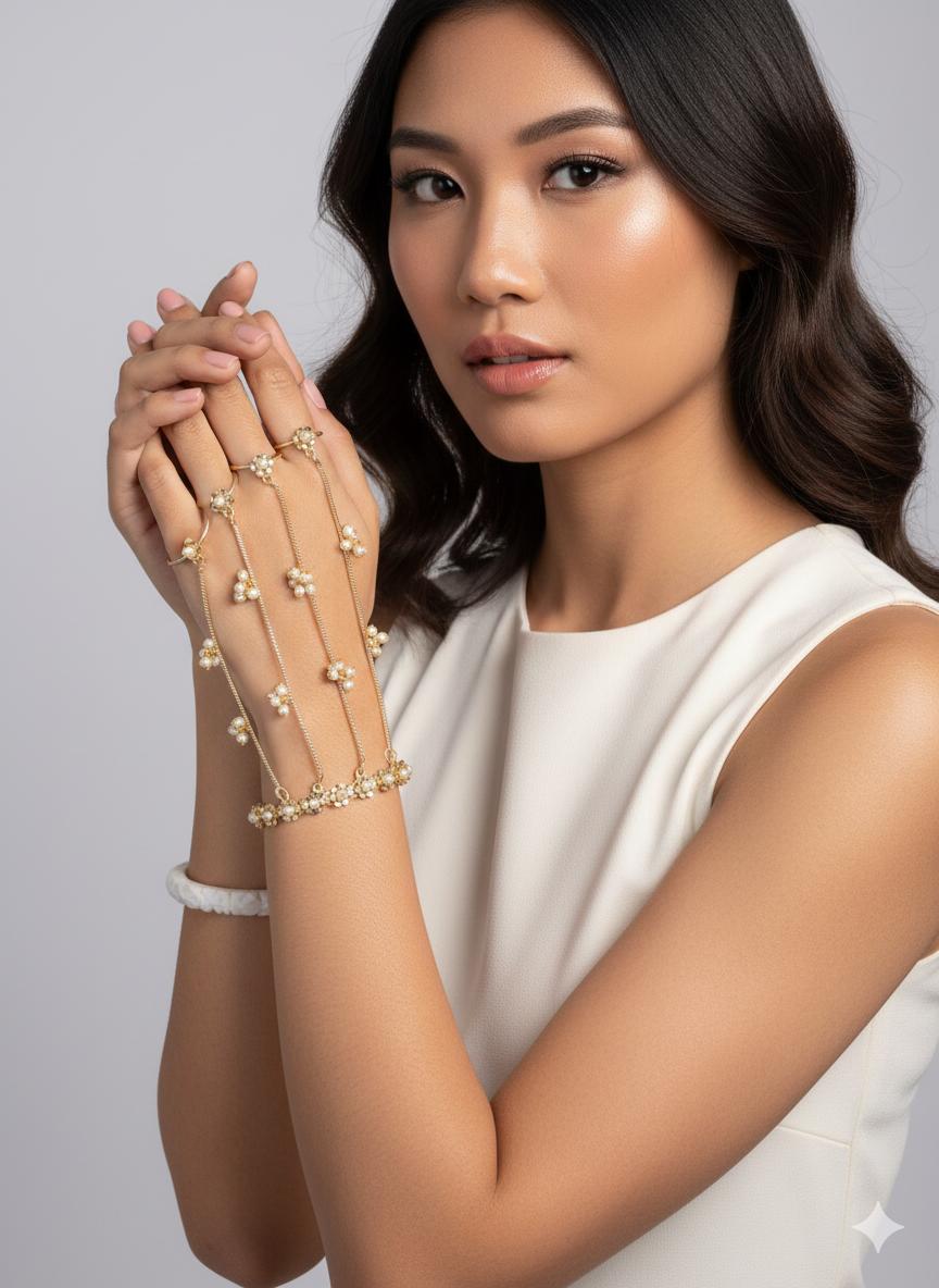 Redefining traditional hand jewelry with a bold contemporary edge, this Brass-Based Flower Hathphool with Moti Puwai is a celebration of elegance in motion. Crafted on a rich brass base, the floral centerpiece is intricately designed to capture timeless beauty, while cascading moti puwai (pearl bunches) add softness, rhythm, and graceful movement.