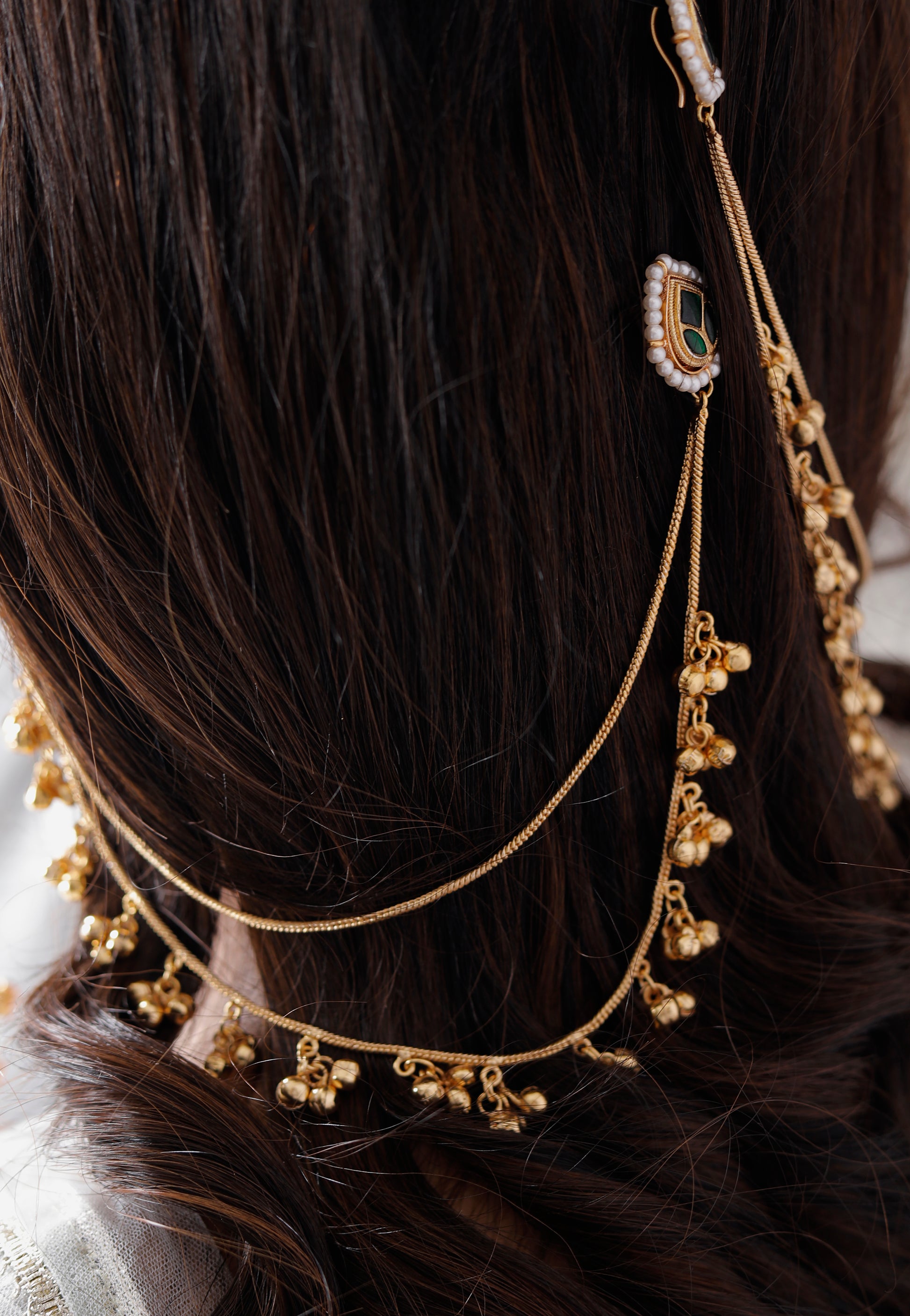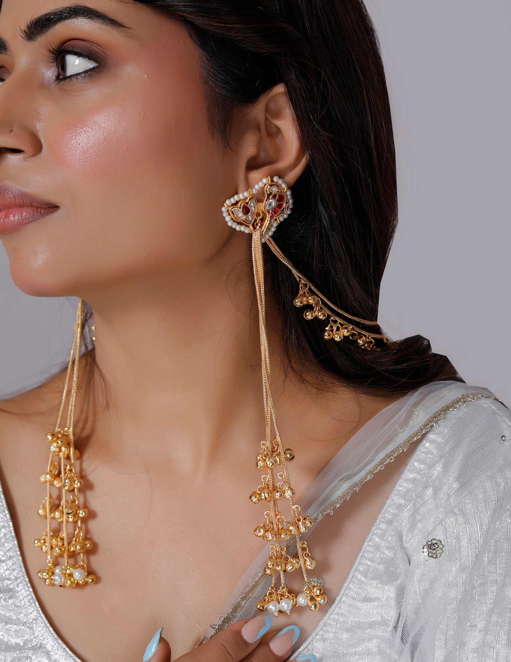 brass and finished with a radiant golden polish that gives it a rich, regal appeal. The chain features delicate ghungroo accents that add a soft, traditional chime with every movement. At its center rests a beautifully detailed paachi kundan peacock pendant, showcasing vibrant stones and intricate handwork inspired by classic Kashmiri artistry. Perfect for festive wear, weddings, and cultural occasions, this statement piece blends tradition with bold elegance, making it a must-have accessory for lovers of heritage jewelry.